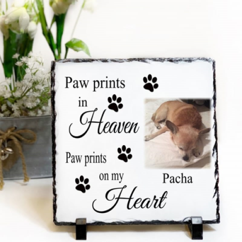 Remember a special pet with one of our personalised, remembrance slates. These excellent quality slates make the perfect gift for anyone missing their pet, These precious slates were lovingly designed in house, with bringing comfort to those struggling through loss in mind. These beautiful remembrance slates have brought joy and comfort to so many of our customers and are available in a variety of designs. Featuring a carefully selected, heartfelt quote reading 'Paw prints in heaven, paw prints on my heart.' as well as a personalised name and photograph making this keepsake irreplaceable.